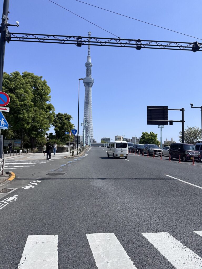 浅草駅から歩いて向かう途中、東京スカイツリーが視界に入ってきます。