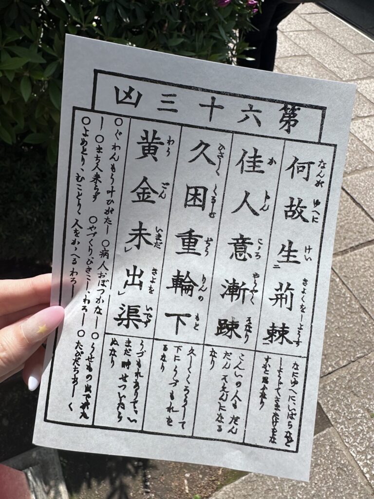 おみくじには「何故生荊棘(なんゆえせいきょくをしょうず)」という言葉から始まり、大切な人との縁が次第に遠のくこと、長い苦労が続く状況、金運はまだ開花の時ではないことなどが記されていました。
