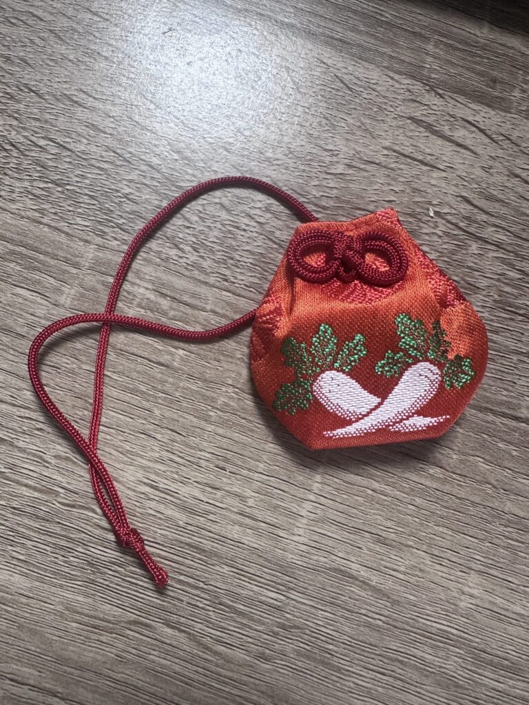 二股大根が刺繍された巾着型のお守りで、赤と紺の2色展開になっていました。